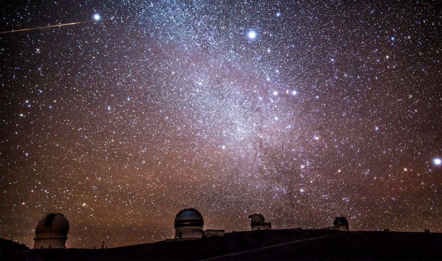 【莫纳基火山】(Mauna Kea,夏威夷语意为“白山”)是位于夏威夷大岛的一座火山,是世界海岛山脉的最高峰,海拔4205米。莫纳基峰顶被公认为全世界最佳的天文台台址,因此他是世界上顶尖的天文学家和天文台的家。山顶的位置在40%的大气和90%的水蒸气之上,因此有着格外清楚的星空影像。此外,山峰位于逆温层之上,每年可以有300个晴朗的夜晚;同时,北纬20度的低纬度,几乎可以看尽南北半球的天空。大岛人口的低密度也意味着这里只有非常轻微的人造污染。所有的这些因素,造就了它成为天文科技发展的殿堂。那里有迄今为止人类最先进的天文观测设备。