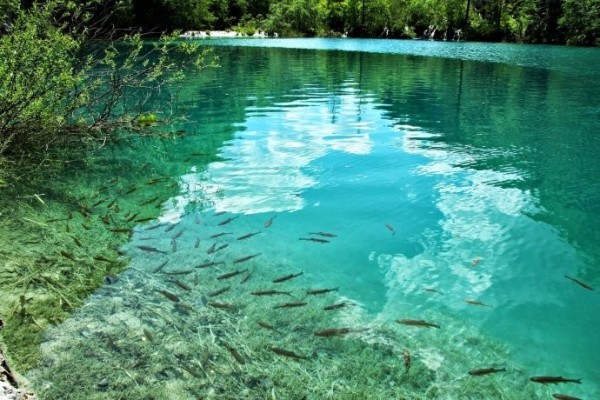 湖泊水质呈现特殊色泽,水中树木表面,钙结成古铜物质,光洁可爱且不朽爤,形成罕见水底玉树奇观。