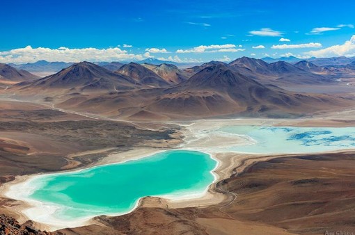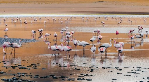 红湖呈现红色是因为红色的藻类聚集,此外还有大片的白色沉积物相互交织,色彩层次丰富,是非常好的摄影取材点。湖面上常见成群出没的火烈鸟,倒影在湖面中,非常梦幻;绿湖呈现绿色是因为矿物沉积,湖背后是高耸的山峰,也是玻利维亚和智利的界峰