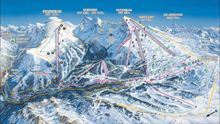 雪场距离班夫镇仅有8公里约20分钟的车程,太阳村雪场是加拿大海拔最高,雪季最长的,81年的历史底蕴让这座滑雪场充满历史的气息,不过不要担心,设施还是非常给力的。太阳村滑雪场由3座山峰组成,山峰海拔比周围的山都要高,垂直落差竟然达到了1070米,天气清朗的时候站在山顶,可以远眺周围两个省的风光。107条雪道绝对可以让你好好的在这滑上几天,只要你的体力没问题,最长8公里的雪道绝对是你最佳的伴侣。雪道占比非常适合中级水平的雪友,初级道20%、中级道55%、高级道25%。12条缆车坐落于雪场各处,最具特色的当属世界上最快捷的8人座缆车,它可以很快的把你运送到山顶,运载力相当的惊人,这样就免去了大家长时间排队的时间。