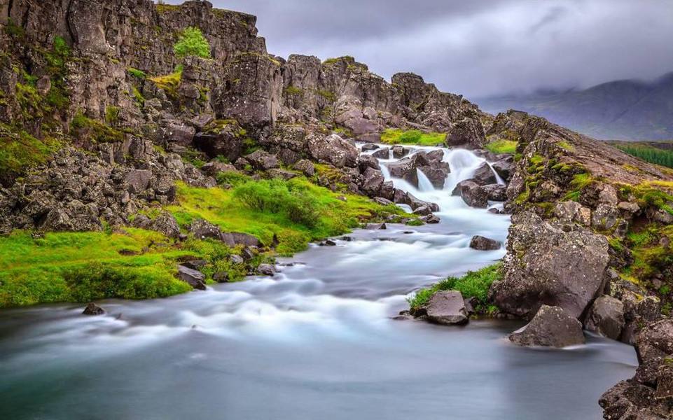 这里曾经是世界上最老的议会所在地,成立于公元930年,也被认为是冰岛行程的起源。欧亚板块和美洲板块分裂后形成的断裂带在这里保存完好,辛格维利尔裂谷仿佛地球天然美丽的伤疤一样。断层北部悬崖为美洲板块部分,悬崖右边属于欧亚板块。纯洁如镜的【议会旧址湖】,面积84平方公里,拥有世界上最纯净的淡水,最深处有114米,比海平面还低12米﹐平均深度近40米,湖水容积达30亿立方米,是“冰岛第一大湖”。